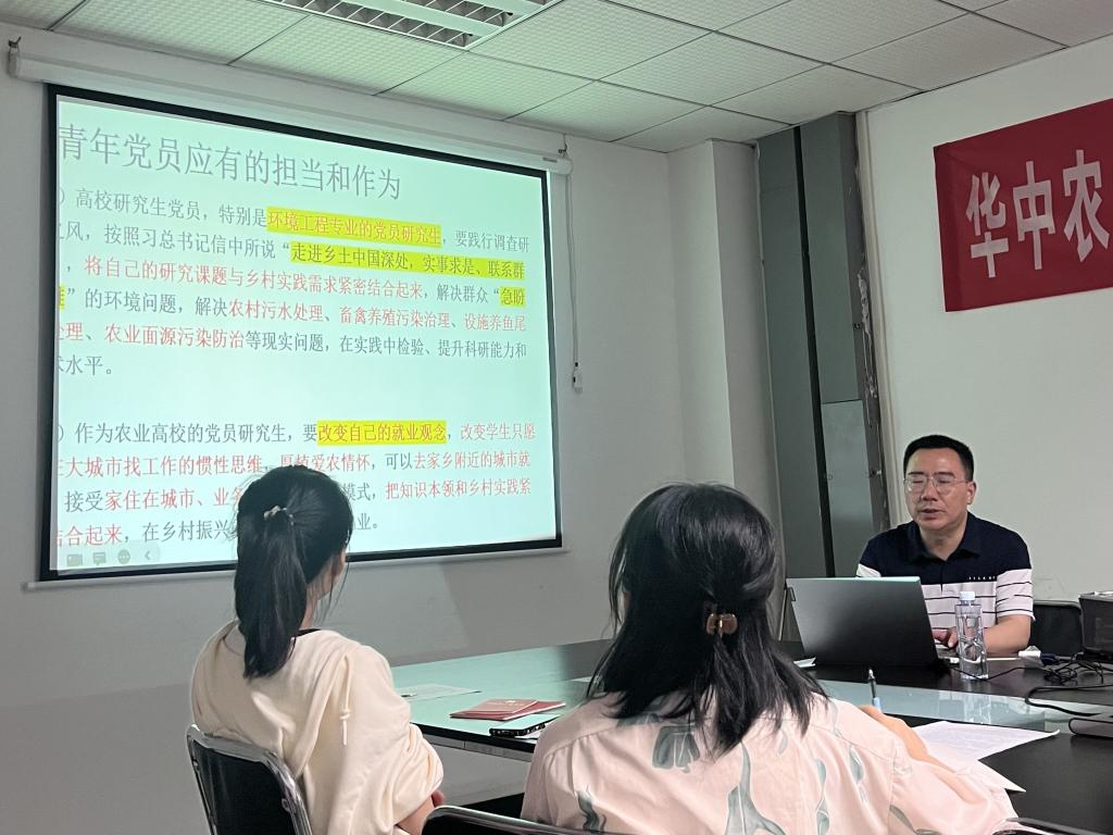(通讯员:代婧)5月26日下午,学院环境工程研究生党支部在东附楼306会议室开展5月主题党日活动,支部党建指导教师周文兵教授以“科技创新和乡村振兴大背景下青年党员的担当与作为”为主题,为支部成员讲授专题党课。