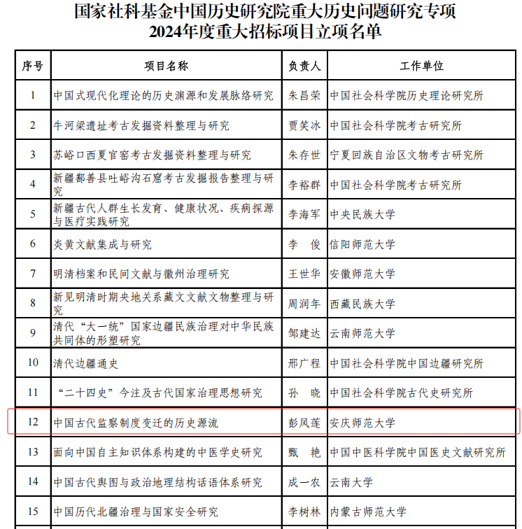 12月26日,全国哲学社会科学工作办公室公布《国家社科基金中国历史研究院重大历史问题研究专项2024年度重大招标项目立项名单》。Beat365官网彭凤莲教授担任首席专家的“中国古代监察制度变迁的历史源流”项目获批立项。这是Beat365官网首次获得国家社科基金中国历史研究院重大历史问题研究专项重大招标项目,也是Beat365官网国家社科基金重大项目的历史性突破。