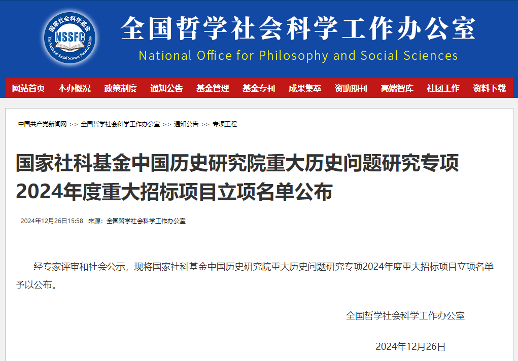国家社科基金重大项目是我国哲学社会科学领域级别最高、分量最重的国家级研究项目,代表了人文社会科学研究的国家水准。国家社科基金中国历史研究院重大历史问题研究专项是国家社科基金重大招标项目中的专项项目,旨在加快构建中国特色、中国风格、中国气派的新时代历史学学科体系、学术体系、话语体系,推出具有重大学术创新价值和文化传承意义的创新性、标识性研究成果,推动史学研究为党和国家工作大局服务,为繁荣发展哲学社会科学服务。