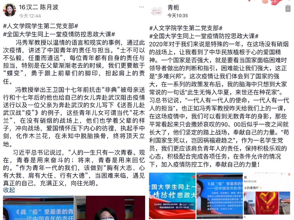 此前,党支部召开专题党课,专题学习观看了“全国大学生同上一堂疫情防控思政大课”。支部通过微党课的形式,动员每位党员同学在QQ空间积极发表自己的思政大课学习微感悟,带领更多同学思考和讨论。“每位青年都有自身的责任与担当,特别是在父辈渐渐老去的时候,我们更要敢于‘蝶变’,勇于跟上前辈们的脚印,担起肩上的责任”,来自2016级汉语言文学专业的陈月波在自己的微感悟中这样写道。