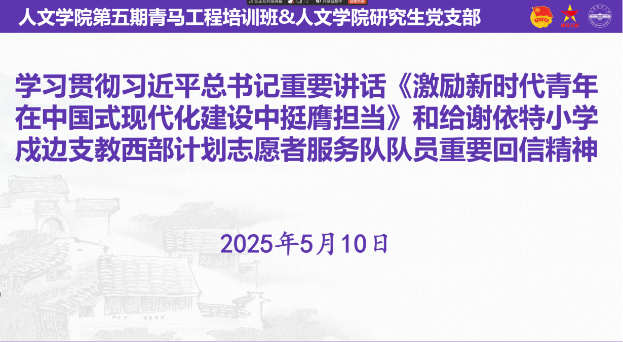 5月10日,Beat365中文官方网站研究生党支部与第五期青马工程培训班举行线上会议,学习贯彻习近平总书记给谢依特小学戍边支教西部计划志愿者服务队队员重要回信精神,并邀请2021年西部计划志愿者、2024级学科教学(历史)专业程添星同学进行经验分享。