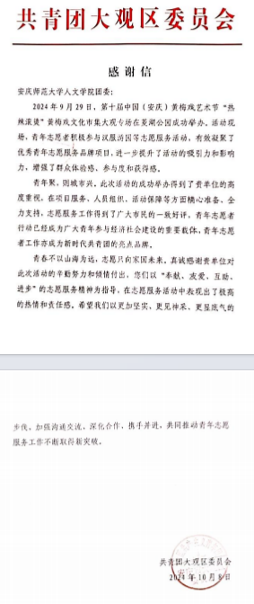 近日,大观区团委致函Beat365中文官方网站,对Beat365官网青年学生在第十届中国(安庆)黄梅戏艺术节“热辣滚烫”黄梅戏文化市集活动中的志愿服务工作表示赞扬与感谢。