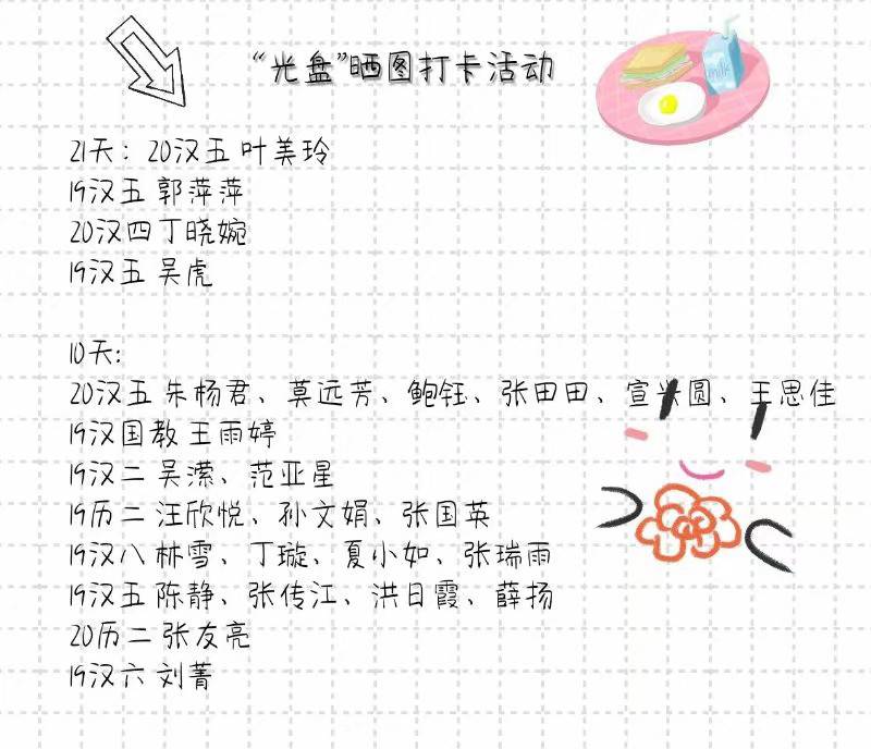 活动要求学生利用个人QQ等网络平台连续多天晒出自己的“光盘”图片,鼓励同学们养成勤俭节约良好习惯。活动开始后,各班同学积极报名,踊跃参与,在相关社交平台集体打卡签到,在学院内形成良好新风尚。