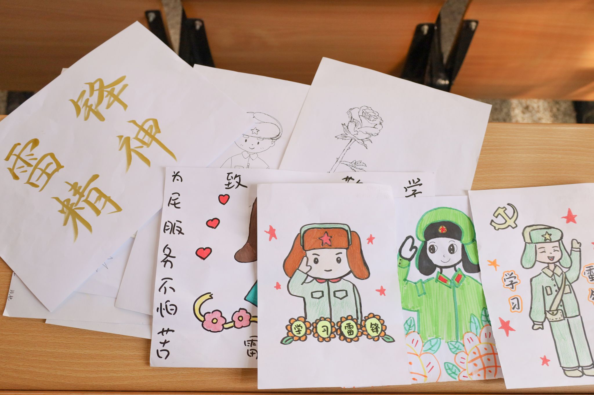 活动现场,学生们领取A4纸,用手中画笔精心创作。一幅幅绘画作品色彩斑斓、构思精巧,直观地再现了雷锋帮助他人的动人场景,展现雷锋在岗位上专注工作的模样,生动展示了雷锋精神的丰富内涵。与此同时,书法展示区热闹非凡,参与者们手执毛笔,蘸取墨水,写下“向雷锋同志学习”、“全心全意为人民服务”等经典语句,笔划刚劲有力,以书法之美传递对雷锋精神的尊崇。