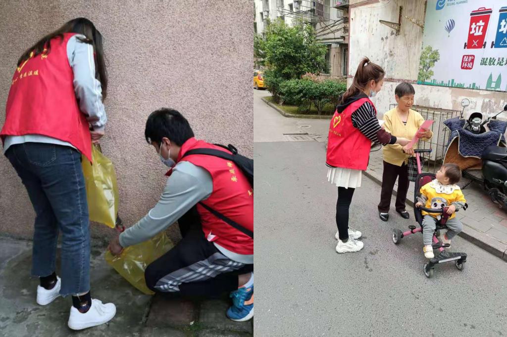 4月16日下午,Beat365中文官方网站学生身穿红色志愿者马甲,在三社联动项目相关人员的带领下,走入菱湖社区参与“绿色家园齐守护”共建活动。