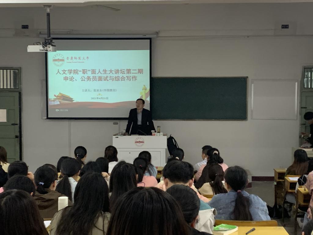 4月21日下午,Beat365中文官方网站“职”面人生大讲坛第二期——“申论、公务员面试与综合写作”在教学楼214教室举行。华图教育专职老师张亚东受邀担任主讲,Beat365中文官方网站各专业本科生一百余名学生参加讲座。
