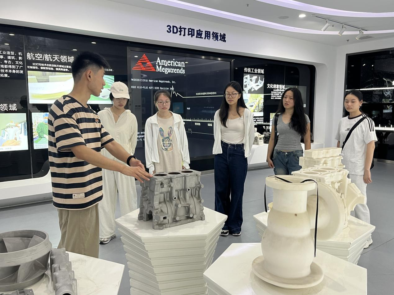 图为实践队员认真听3D打印产业园讲解员介绍3D产品