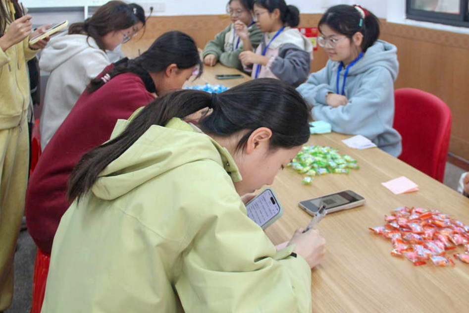 “冬日暖阳,赠你一颗糖”环节中,颜色各异的便利贴和口味多样的糖果整齐排列,吸引学生驻足。参与者可以选择任意颜色的便利贴,写下喜爱的冬日诗句,以此兑换一颗糖果。“南堂冬日明,窗户暖可喜。”通过写诗句换取糖果的妙想,参与者们以诗为媒、以糖传情,感受活动中蕴含的温暖关怀。