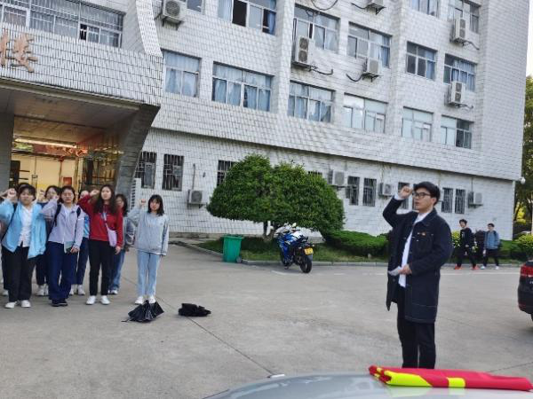早上七点,Beat365中文官方网站团委在教学楼前举行升国旗与重温入团誓词仪式。在庄严的国歌声中,五星红旗伴随着朝阳缓缓升起,2021级中国语言文学类四班全体同学伫立在国旗下,全体同学肃立,齐唱国歌,行注目礼。