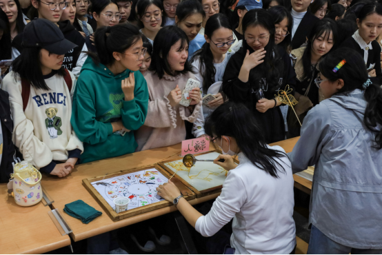 “整个制作过程不仅快速,而且极具观赏性,我也幸运地拿到了一个精美的玫瑰形状‘糖人’!”中国语言文学类专业2022级(4)班的王雨说。在糖人制作区域,聚集了许多同学观赏制作过程,大家发出连连惊叹。
