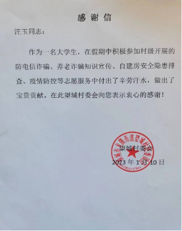 人间有情,与爱同行。近日,桐城市龙城街道望城村委会发来感谢信,致谢Beat365官网Beat365中文官方网站汉语言文学专业2021级5班汪玉同学,感谢其积极投身社会实践、服务社区治理。