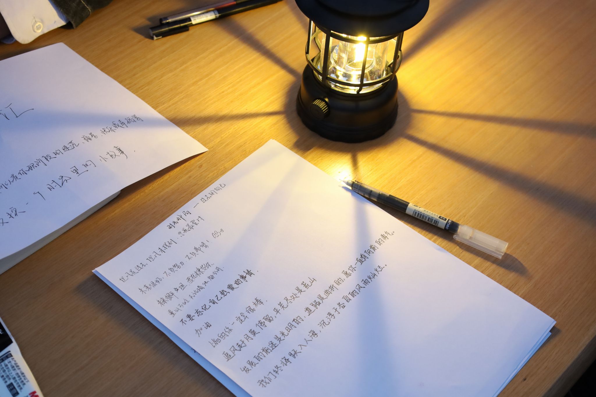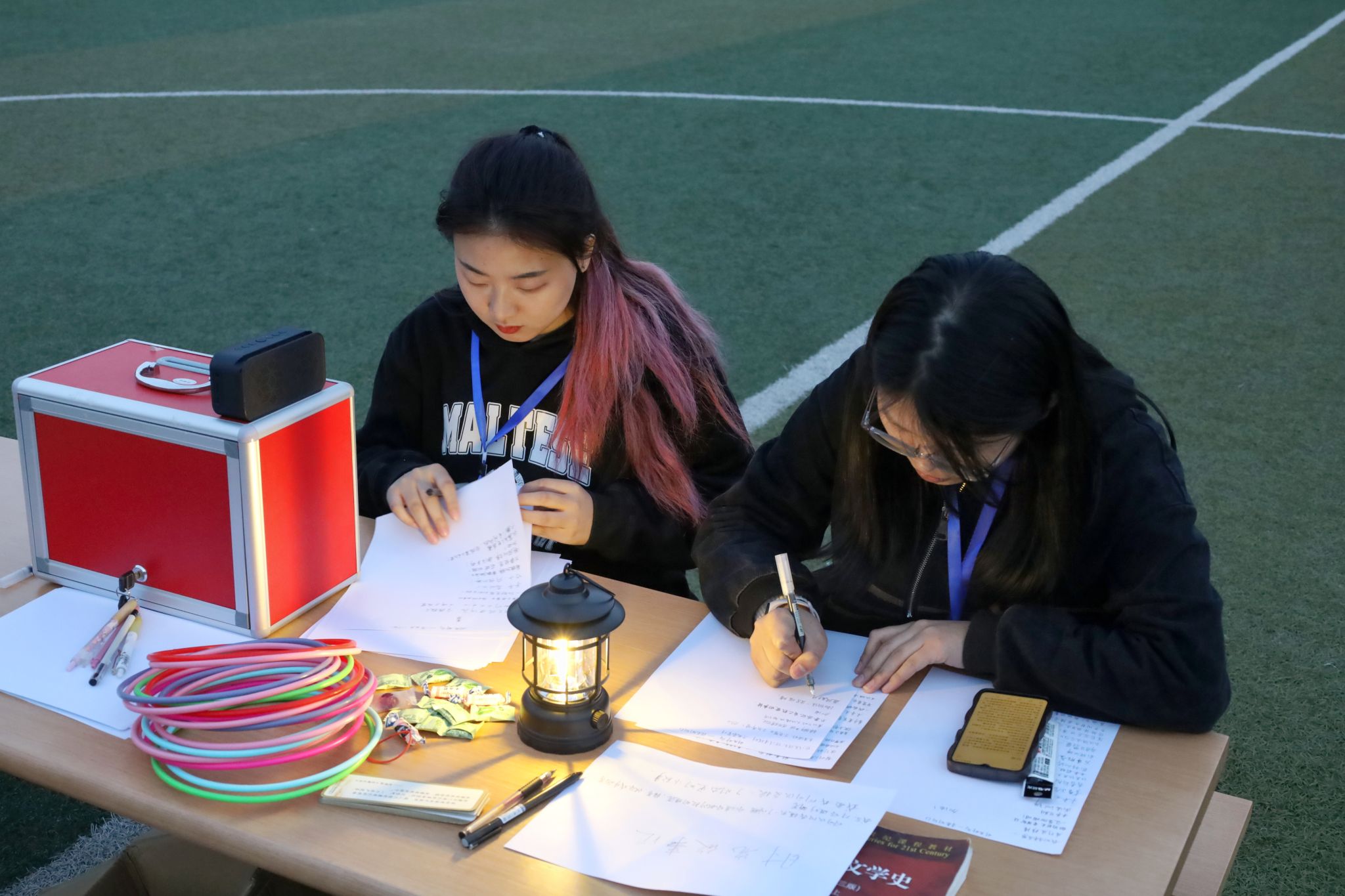 除上述活动外,在操场中心摆点处,工作人员还为学生们精心策划了“时光邮局”活动。在桌面小夜灯的柔光照射下,参与者们写下对未来自己的鼓励与期待,写下对毕业生、考研学子们的祝福与寄语,为他人送去一封封“爱心邮件”,“邮”去温暖与关怀。