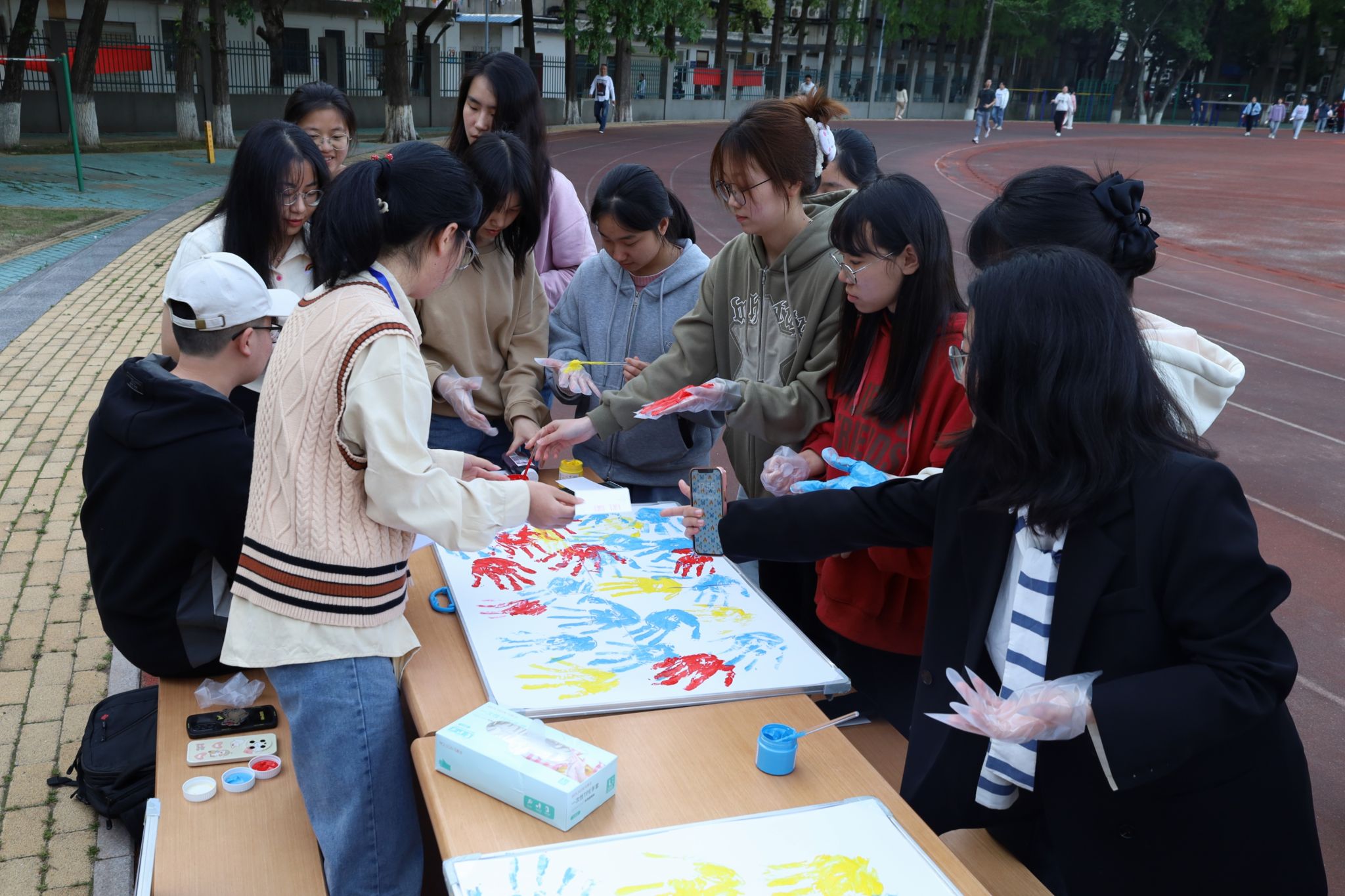 “大家先戴上pvc手套,再用刷子蘸取袋子里的颜料。”活动现场,学生们在摆点处可领取到一张空白纸张,进行手印画的创作。工作人员耐心地指导每一位参与学生印下自己的手印,并向学生们介绍该活动的寓意所在:“青年学生留下彩色的手印,寓意青年学子‘为青春而喝彩’。”