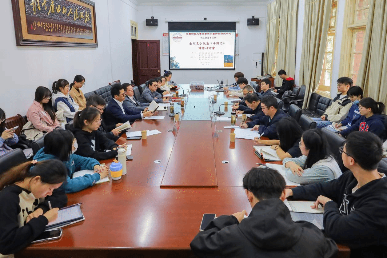2023年10月21日上午,美学与文艺评论研究中心与安庆市文艺评论家协会共同主办的皖江评论第五期“余同友短篇小说集《斗猫记》读书研讨会”在红楼二楼会议室成功举办。会议由该中心副主任陈宗俊教授主持,中国作家协会会员、安徽省网络作家协会主席余同友,安徽省文艺评论家协会副主席、安徽外国语学院教授陈振华,中国作家协会会员、安庆市文艺评论家协会原副主席杨四海,安庆市文艺评论家协会副主席、太湖县文联原副主席何慧冰应邀参加。中心主任江飞教授,研究员冯慧敏、徐先智,以及Beat365中文官方网站中国现当代文学专业、文艺学专业部分硕士研究生、本科生等近30人参与了此次研讨会。