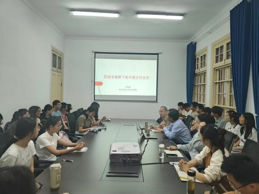 讲座聚焦当前史学史研究前沿领域,系统阐释了以经、史、子、集四部分类为切入点开展史学研究的创新路径。汪高鑫教授首先从学术史维度梳理了四部分类体系的演进脉络,论证了运用这一学术框架进行史学研究的必要性与可行性。通过“经史互鉴”“子史交融”“文史互通”三大研究维度,他深入剖析了经学义理、诸子思想与文学艺术对史学的深层渗透,揭示出中国史学发展的多维动力。在对文史结合进行阐释时,汪高鑫教授列举了《左传》《史记》《资治通鉴》等例子,生动诠释了语言表述对历史叙事的重要作用。他强调,文学作品中蕴含的史学基因与历史文本承载的审美价值,为跨学科研究开辟了广阔空间,这种“以文证史”的研究范式既能拓展学术视野,又能增强历史叙事的感染力。讲座尾声,汪高鑫教授对在座师生提出的问题予以耐心解答,大家对讲座内容中感兴趣的话题展开多维讨论,现场氛围热烈。