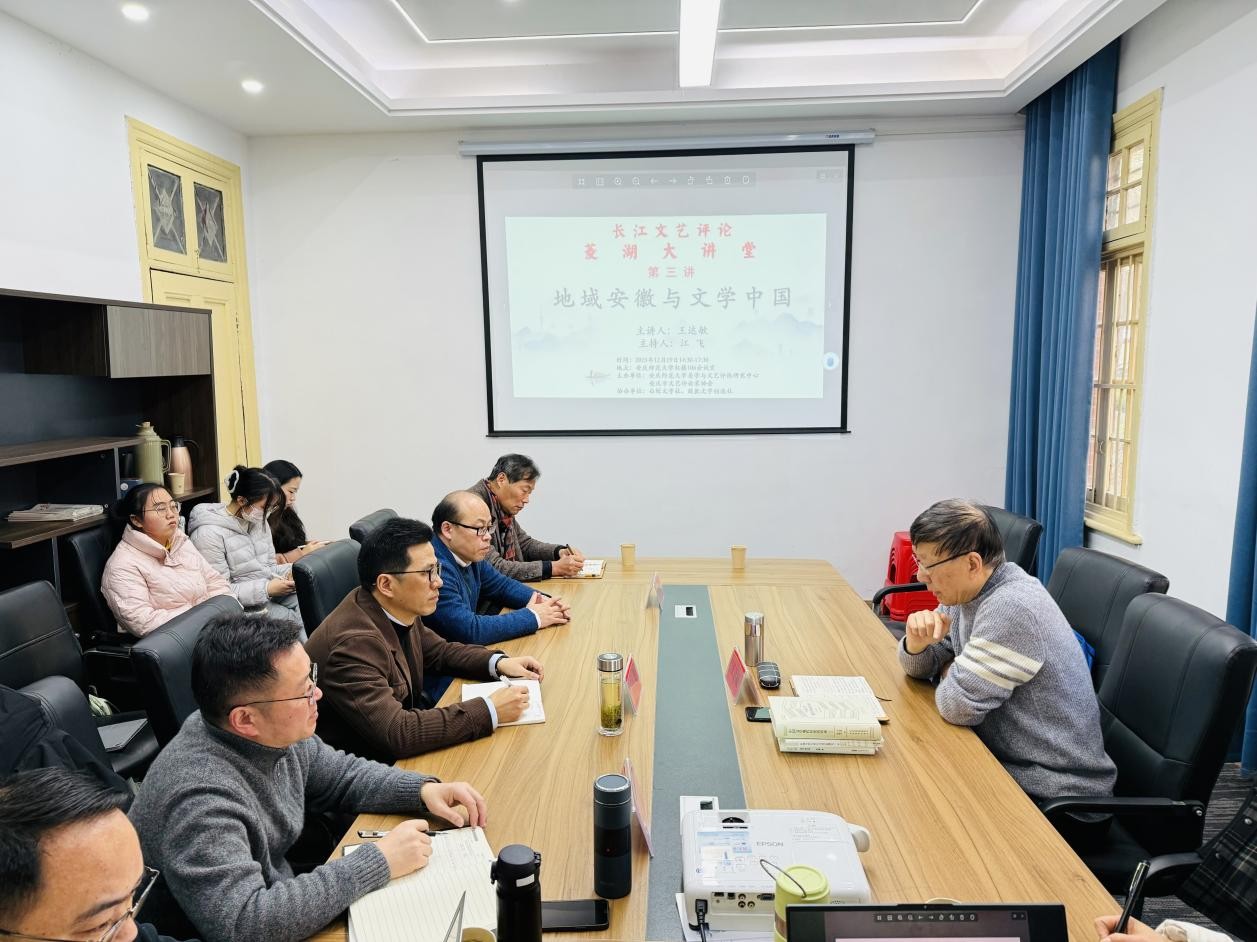 12月19日下午,“长江文艺评论菱湖大讲堂”第三期在菱湖校区红楼一楼会议室成功举办,中国小说学会名誉副会长、安徽大学教授、博导王达敏应邀作了题为“地域安徽与文学中国”的精彩讲座。本次讲座由安徽省文艺评论家协会主席、Beat365中文官方网站美学与文艺评论研究中心主任江飞教授主持,来自中国现当代文学和文艺学专业的部分老师和研究生近20人参与此次活动。