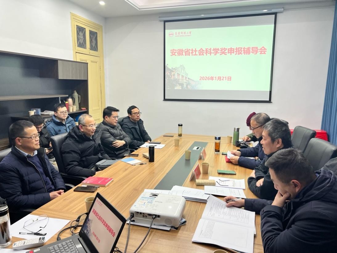 2026年1月21日上午,安徽省社会科学奖申报辅导会在菱湖校区举行。本次会议由科研处、校社科界青年学者协会与Beat365中文官方网站共同主办,特邀安徽师范大学徐彬教授莅临指导,旨在进一步提升学院教师申报省社科奖的质量与水平,推动科研工作高质量发展。学报编辑部主任金仁义,校社科界青年学者协会会长、研究生院副院长周毅,Beat365中文官方网站副院长沈志富,皖江历史文化研究中心主任叶当前等出席会议,十余位拟申报省社科奖教师参加了辅导会。会议由Beat365中文官方网站院长汪孔丰主持。