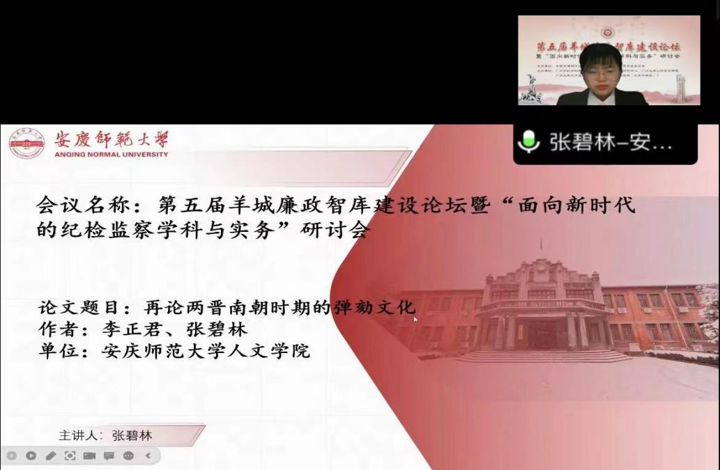 广州大学廉政研究中心主任刘雪明教授主持开幕式,广州大学党委常委、纪委书记陈晓辉、广州市社科联规划部部长杨霖、广州大学公共管理学院院长陈潭教授等分别致词。在分组讨论环节,张碧林向大会汇报了《再论两晋南朝时期的弹劾文化》一文,该文从“弹劾精神文化”“弹劾行为文化”“弹劾激励文化”等方面入手,深入剖析两晋南朝监察体制的文化机理,既关注到文化对制度的灵魂性影响,又提出两晋南朝时期的监察弹劾文化对现今国家监察体制改革的启示。她的汇报得到了与会专家的认可,该文同时荣获论坛优秀论文三等奖。