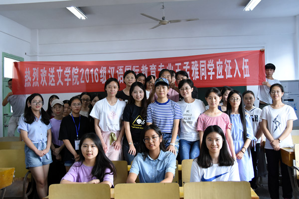 “恭喜南海舰队喜提雅姐!”9月19日下午,在文学院306教室,汉语国际教育专业2016级的学生们举办了一场特殊的送别会,为即将远赴广东参军的王孟雅同学送行。