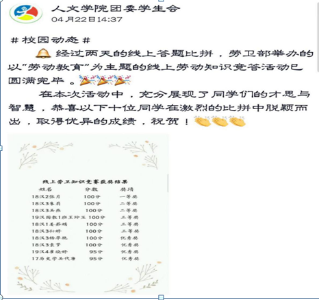 为宣传生活中常用的劳动小妙招,增加同学们的劳动知识,线上劳动知识竞答也受到了同学们的广泛好评。这次竞答有着单选、多选及判断等多类题型,试题涵盖爱国卫生科普、疫情防范、和劳动卫生等方面的知识。且为支持疫情防控,竞答借助网络平台采取线上的方式进行比拼——参赛学生通过扫描二维码及相关链接进入答题通道并在规定时间内参与答题,按得分和用时长短进行最终排名。经过一番激烈角逐之后,张月、朱莉、吴燕等8名学生均以满分的成绩获奖。