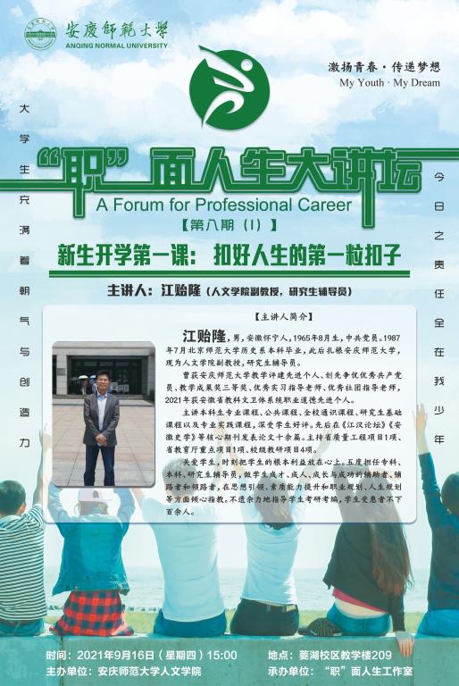 彰显风采,示范引领。为集中展示办学特色和育人成果,学院在敬敷书院两侧摆放展架,Beat365中文官方网站话剧社、《季节风》杂志、龙睛读书社、“五月花”语言艺术晚会、省级样板支部等一批校园文化品牌建设成果和国家奖学金、学科竞赛获奖情况介绍向新生们全面展现了人文学子争先创优、锐意进取的良好风貌。宣传栏里“职”面人生大讲坛—开学第一课的海报吸引了大家的目光,“扣好人生第一粒扣子”助力新生坚定理想,树立志向。