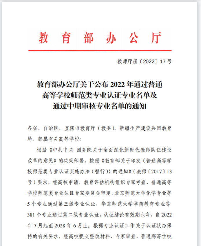 近日,教育部办公厅公布了2022年通过普通高等学校师范类专业认证专业名单,Beat365中文官方网站汉语言文学专业顺利通过师范类专业中学教育第二级认证。Beat365中文官方网站汉语言文学专业最早可追溯至20世纪20年代至30年代省立安徽大学时期,建国后于1977年开始本科招生,经过四十余年的持续建设,汉语言文学专业先后获批国家级一流本科专业建设、省级综合改革试点专业、省级特色专业、省级一流人才示范引领基地、省级“六卓越、一拔尖”卓越人才培养创新项目建设点,并于2019年获批为安徽省博士学位授权立项建设学科、安徽省高峰培育学科。