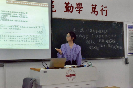 在中学语文组的赛场上。22级汉语言文学一班程甜甜同学以长江的地理环境作为切入点,引出本次试讲的篇目《三峡》。程甜甜同学通过对课文段落语言、写法上的精确解析带领评委老师们身临其境地观赏了三峡的山水、四季之景。程甜甜同学以生动的语言、严密的逻辑使得现场的每个人都融入到她的讲解中,给评委们留下深刻印象。