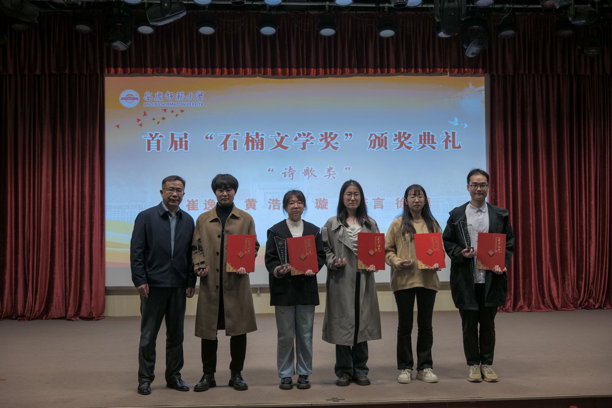文学奖发起人、著名作家石楠先生,安徽曙光化工集团党委副书记、工会主席杨孝兵,泰邦集团董事长张志华等捐赠人,特邀嘉宾、评委代表、《诗歌月刊》主编何冰凌,安徽省作协副主席江飞,学生处、档案馆、校友总会、Beat365中文官方网站负责人参与活动,并与首届文学奖获奖学生、Beat365中文官方网站文典班学生等共同见证颁奖盛典。